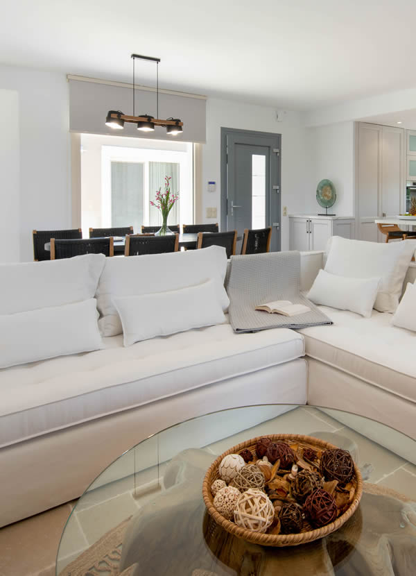 Modern minimalism rules indoors and out. Dive into relaxation with our 50 square meter swimming pool, featuring a serene inside seating area, and enjoy the colors of the breathtaking sunset of Paxos Island.